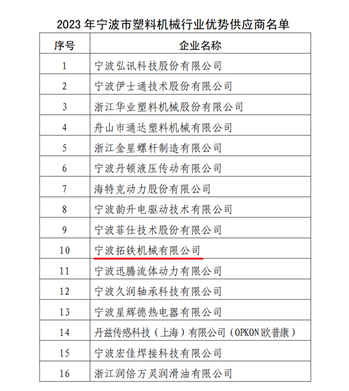根据《关于开展 2023 年度宁波市塑料机械行业优秀供应商评选活动的通知》(甬塑机〔2023〕2 号)文件要求,通过单位推荐和协会提名,最终在 2023 年 4 月 16 日第五届十一次理事会上投票选举产生了 16 家企业为“2023 年度宁波市塑料机械行业优势供应商”。我司有幸获此殊荣,归功于平日里每一位辛勤付出的员工。